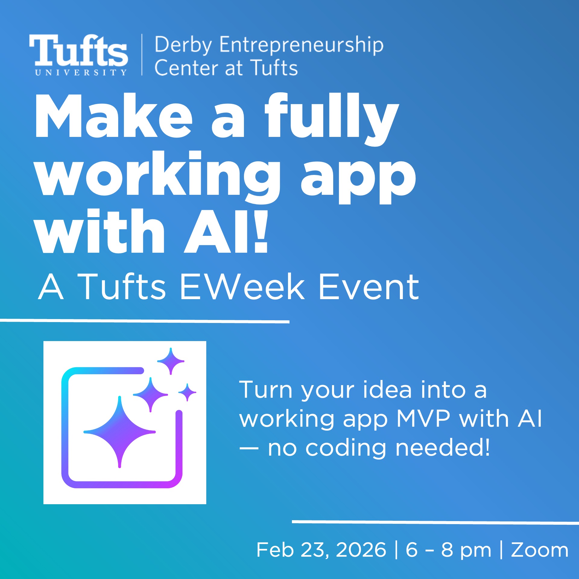 Learn how to build a fully working web or mobile app using AI and no-code tools. Open to university students, faculty, and staff across New England. |